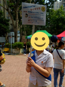 去到學校已經人山人海,正當唔知點埋手既時候見到有個姐姐拎住個牌寫住「學校導賞團」,立即衝埋去: